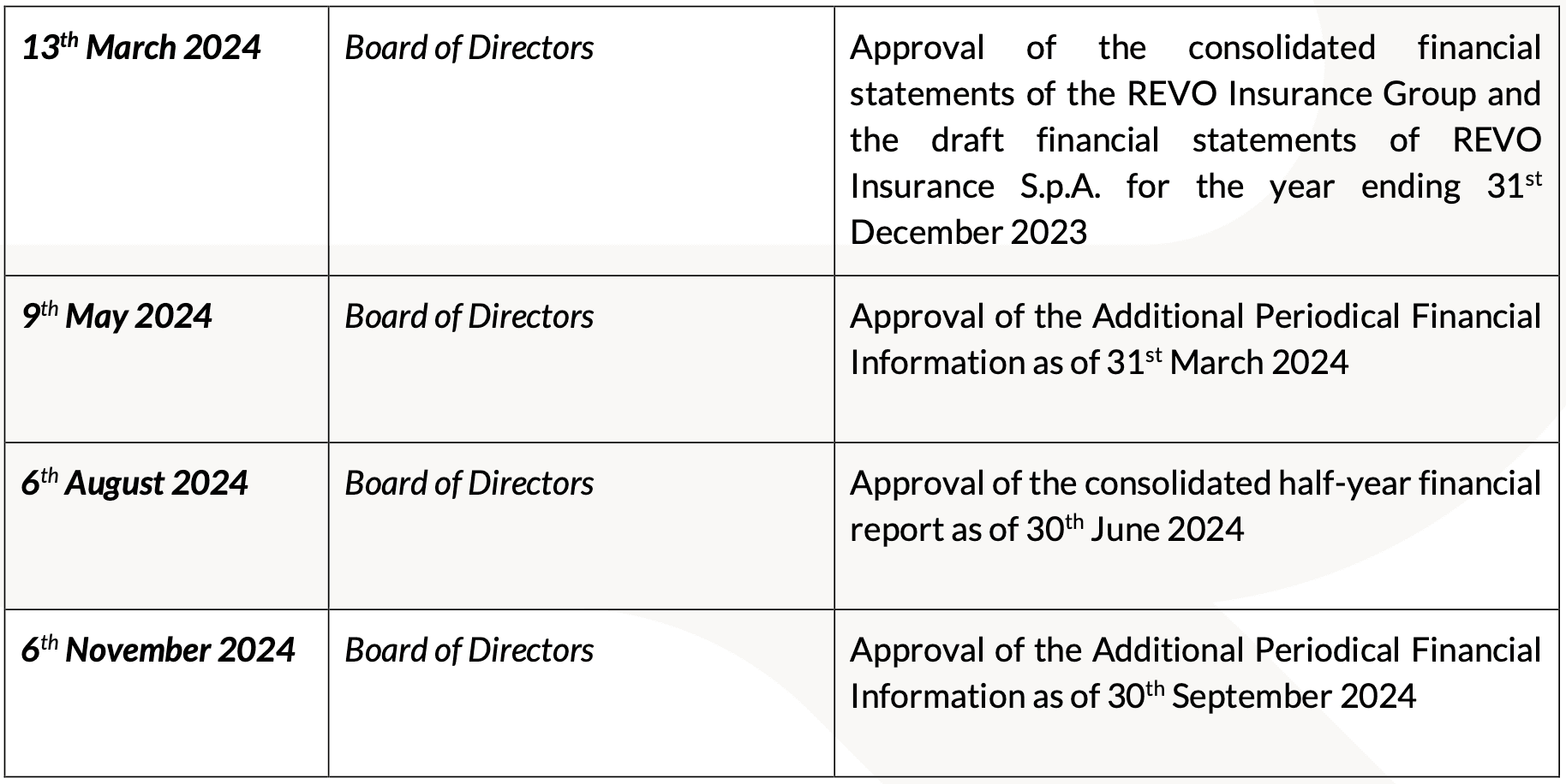 Verona, 15th December 2023 – REVO Insurance S.p.A. (REVO" or the “Company”) announces, pursuant to Article 2.6.2 of the Regulations of Markets Organized and Managed by the Italian Stock Exchange, the annual corporate events calendar for the year 2024.