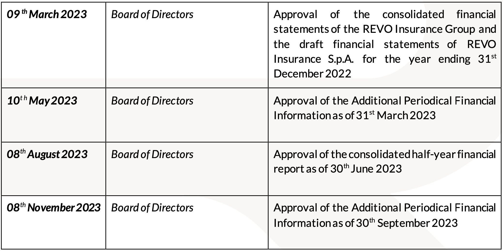 REVO Insurance S.p.A. (REVO" or the “Company”) announces, pursuant to Article 2.6.2 of the Regulations of Markets Organized and Managed by the Italian Stock Exchange, the annual corporate events calendar for the year 2023.